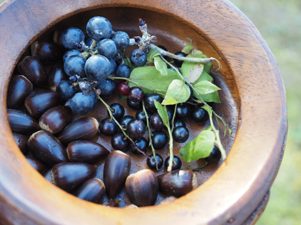 「旅する料理人」の三上奈緒さんはまず「縄文おやつ」を参加者にまわした。シイの実とハゼとヤマブドウ。