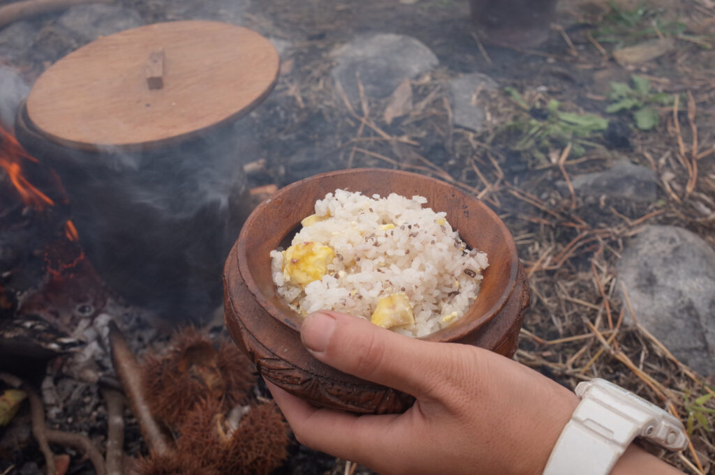 もう ひとつの土器には、イノシシの肉とシイタケのスープ。