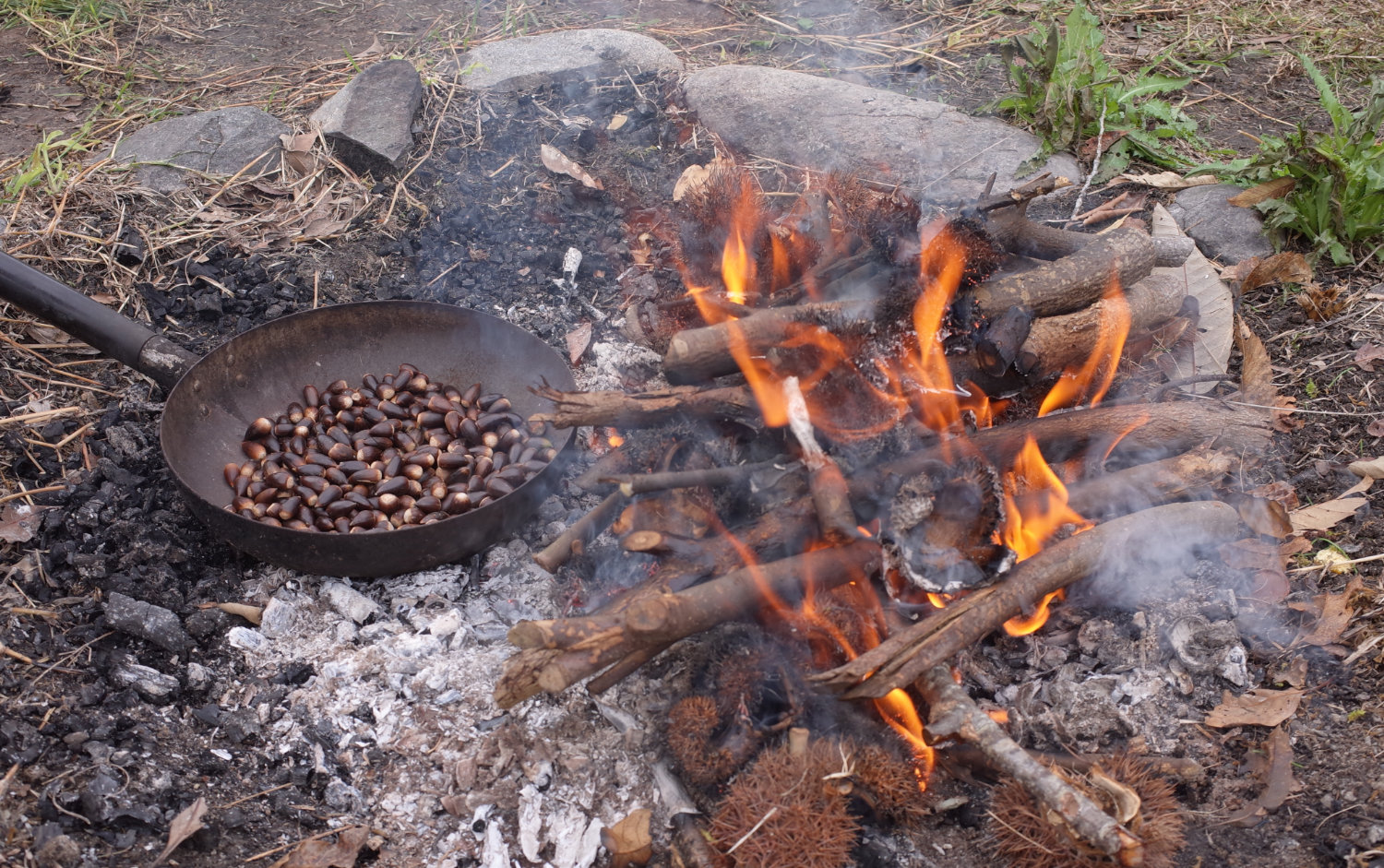 栗の実ははじけないように穴をあけてから煎ったり焼いたりする。
