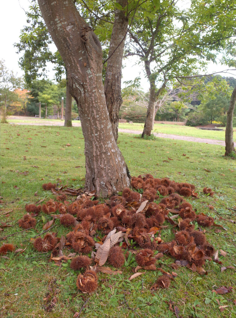 公園内に植えられているシイの実をひろうと、長細いもの、まん丸のもの、小型の実の3種類がある。大きくて長細いのはスタジイ、まん丸のはツブラジイ、小さいのはハイブリッドだろうか。