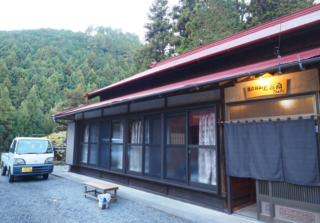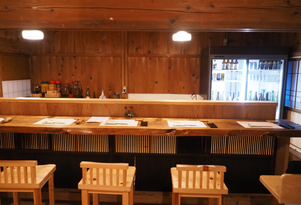 今回宿泊したのはIターン女性がオープンしたばかりの古民家の宿「農作日和たお酉(ゆう)」。茶畑がうつくしい集落のはずれにあります。地元の素材をつかった手のこんだごちそうを、分厚い1枚板でつくられたカウターでいただきました。大きな冷蔵庫には、地元の酒がずらりとならんでいました。