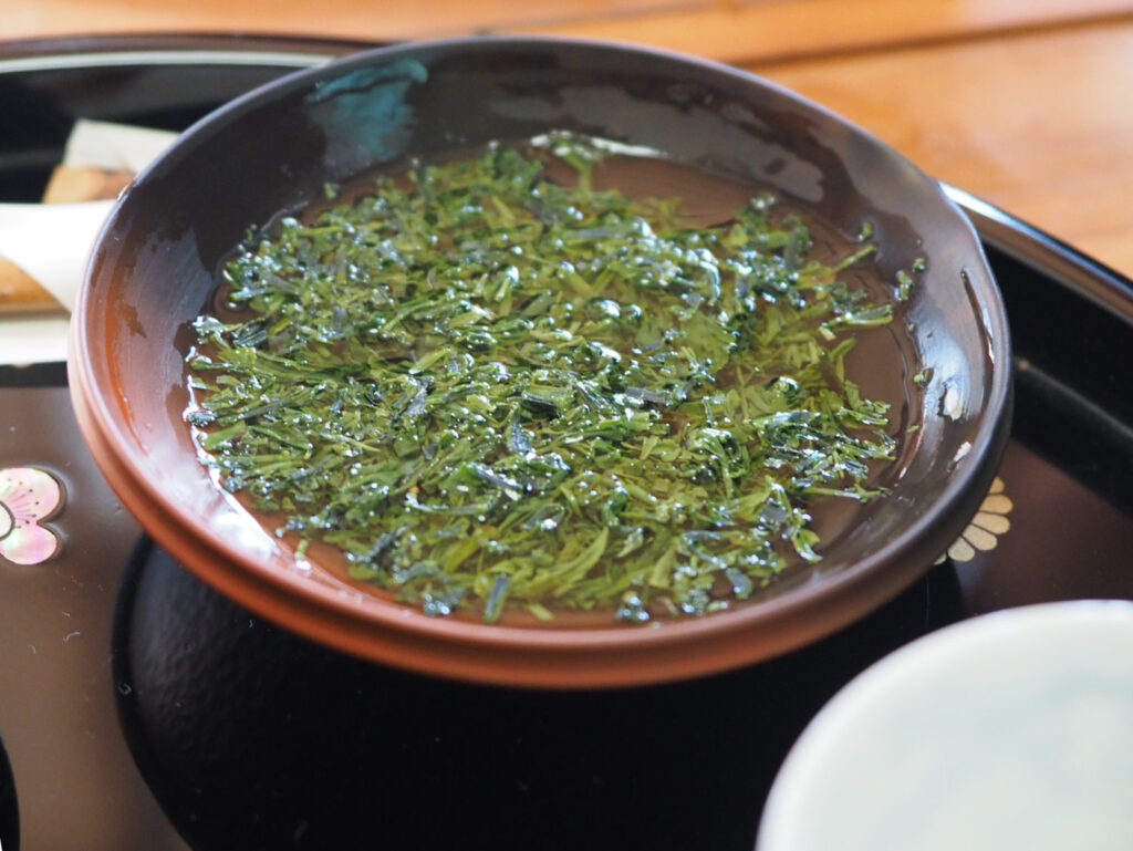 湯冷ましで湯を55〜60度にさます。急須にひろげた3グラムの茶葉に30㏄の湯をまわしいれて1分ちょっと。おちょこのような茶碗に最後の1滴までそそぐ。口にふくむと、だし汁のようなうまみがひろがる。低温の湯だから渋みはでず、自然のグルタミン酸が抽出されるのだ。