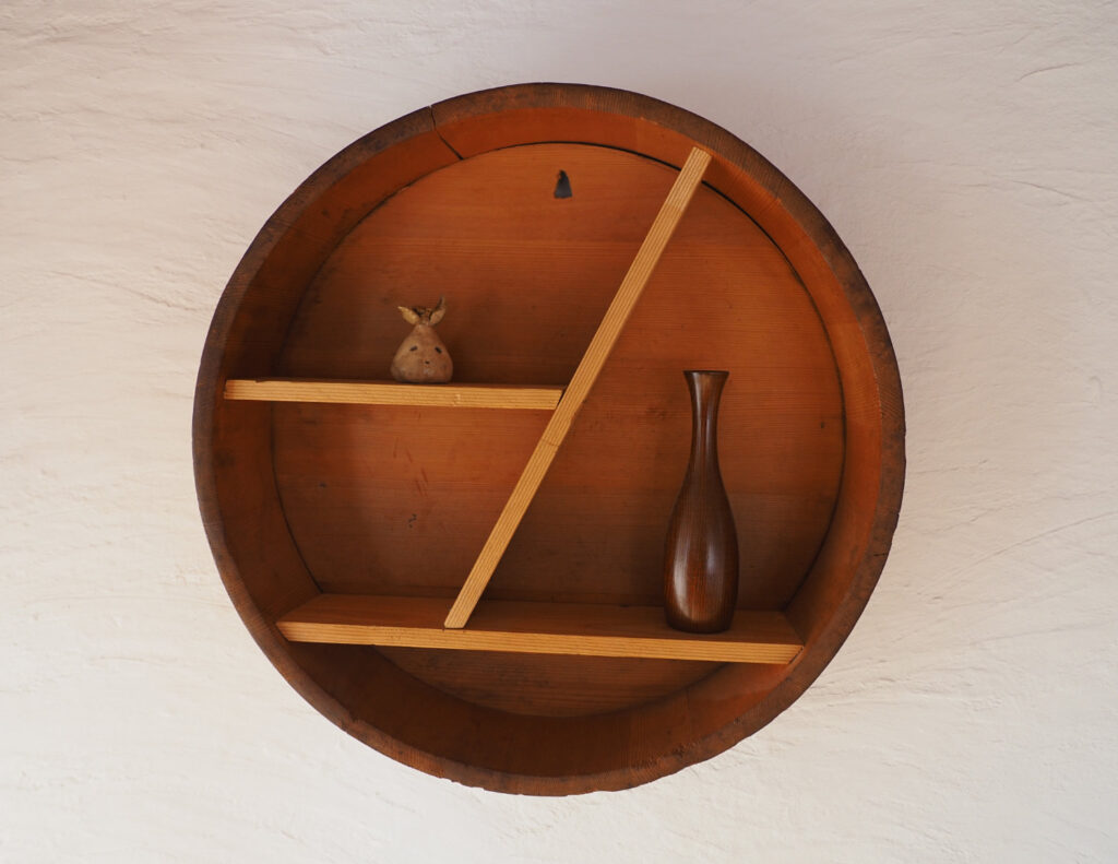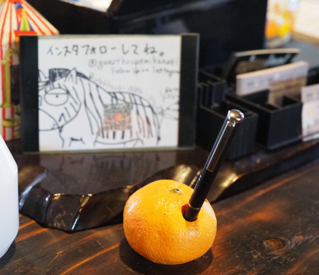 観天寺を目の前にのぞむ部屋には、盥のオブジェや竹をつかったランプがかざられている。ミカンにボールペンがささってる! と思ったら、プラスチック製だった。