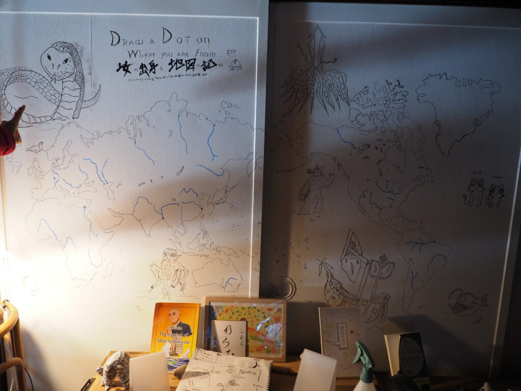大きな掘りごたつのテーブルはリビングのよう。わきには世界地図があり、お客さんが自分の出身地にしるしをつける。