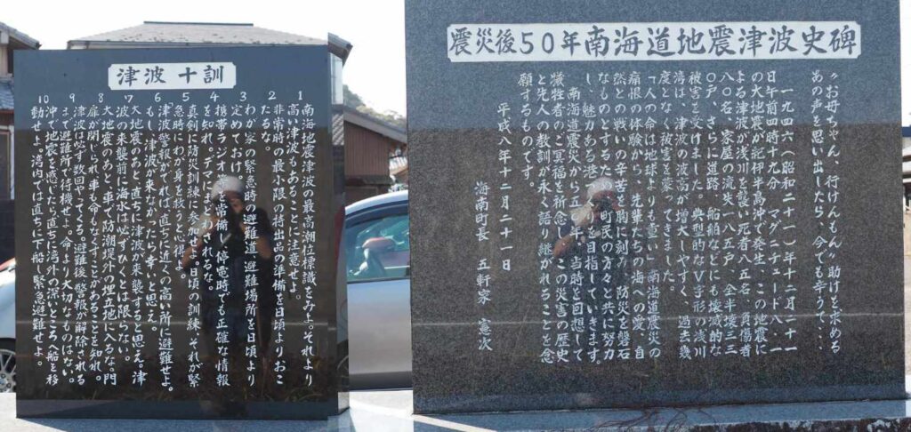 碑文は、148年前の宝永4年の大地震で小舟で避難した多くの人が死んだことをとりあげ、「長い年月をへて、伝え聞く人はほとんどいなかったため、また多くの人が犠牲となってしまった……」となげく。そのうえで、「願くハ心あらん人年々文字よミ安きやう墨を入給ふへし」(時々碑文が読みやすいよう墨を入れ、伝えていってほしい)とむすんでいる。