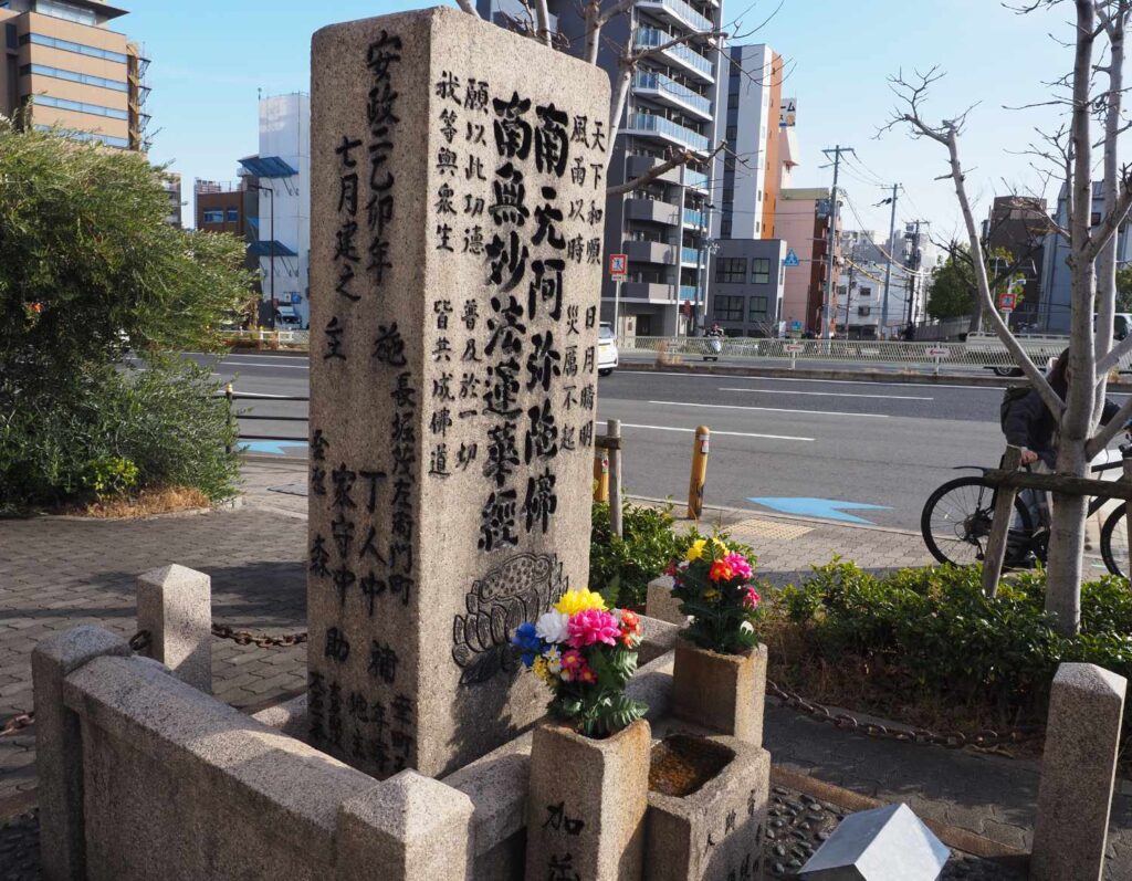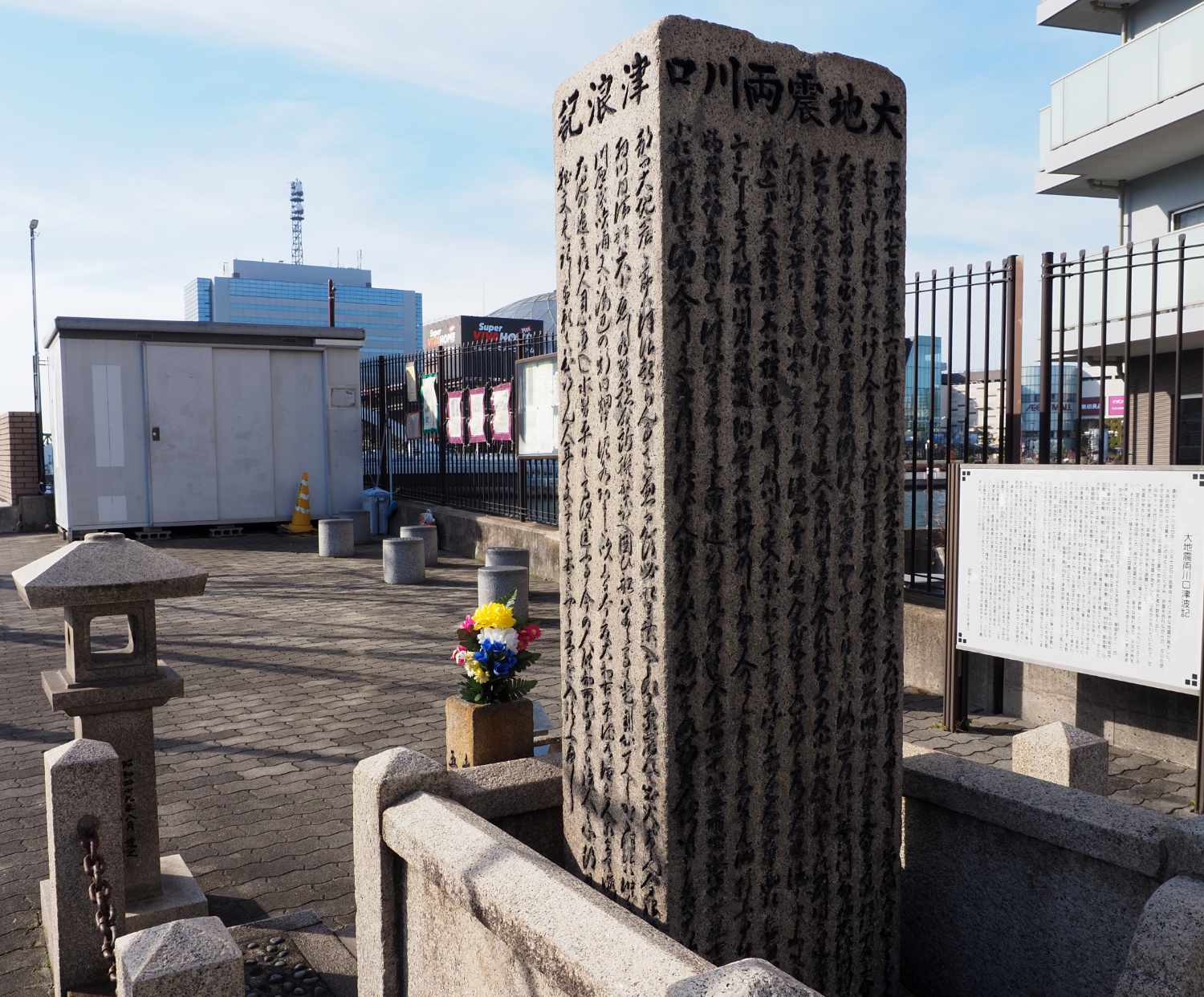 橋の東詰の北側に存在感抜群の2メートルほどの石碑がたっている。「南無阿弥陀仏 南無妙法蓮華経」の文字の下に蓮の花が彫られ、右側面と裏面には「大地震両川口津浪記」がきざまれている。安政の大津波の碑なのだ。架橋前は木津川の渡し場のわきにあったが、大正橋ができてそのたもとに移転し、1974年の道路拡張で現在の場所にうつされた。