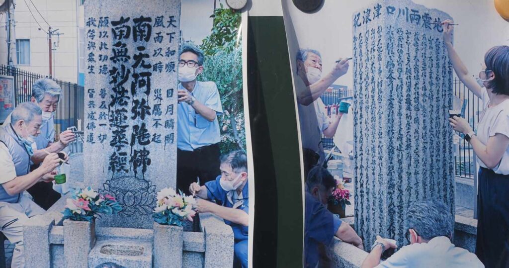 「墨をいれる」という碑の教えを今も住民がまもりつづけている。地元では碑を「お地蔵さん」とよび、記念碑保存運営委員会(幸町3丁目西振興町会)が、毎年8月22から24日の地蔵盆にあわせて碑を洗い、文字に墨をいれているという。