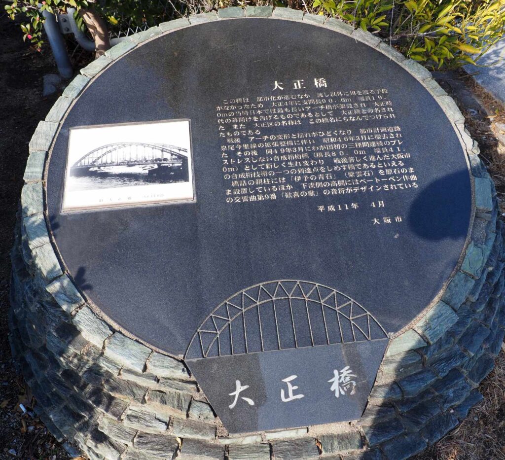 京セラドーム大阪(大阪ドーム)の東に、木津川をわたる「大正橋」がある。かつては渡し場があったが、1915(大正4)年に支間長90.6メートル、幅19メートルの大正橋が架設された。当時日本で最長のアーチ橋だった。「大正区」の名称はこの橋の名前にちなんでいる。橋は1971年に撤去され、3年後に新しい橋に架けかえられた。橋のたもとの親柱には伊予の青石(紫雲石)が原石のままのこされている。