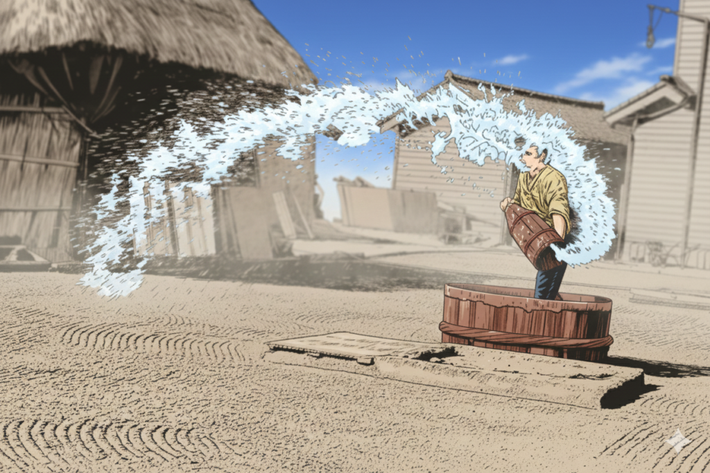 「塩田に海水をまいています。海水を円錐形のおけで広く薄くまく様子をイラストにしてください」