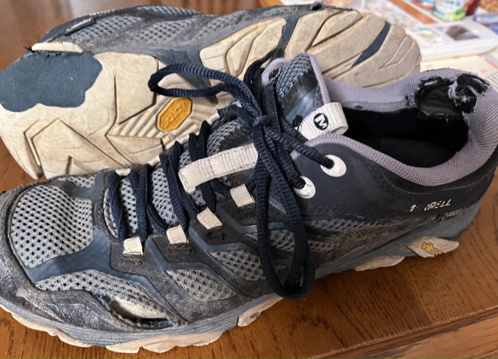 ローカットのハイキングシューズはずっとメレルをはいていた。2019年にメレルの28㎝のゴアテックスの靴を入手して遍路道を歩いた。山歩きや日常にもつかったから2000キロ以上を踏破してボロボロになり、23年にMOAB(19800円)を買った。前の靴はビブラムのメガグリップという靴底でぬれた岩場でも安心できたが、新しいMOABは「丈夫さ」を重視したため、メガグリップではない。雨の日の石畳などはけっこうすべった。