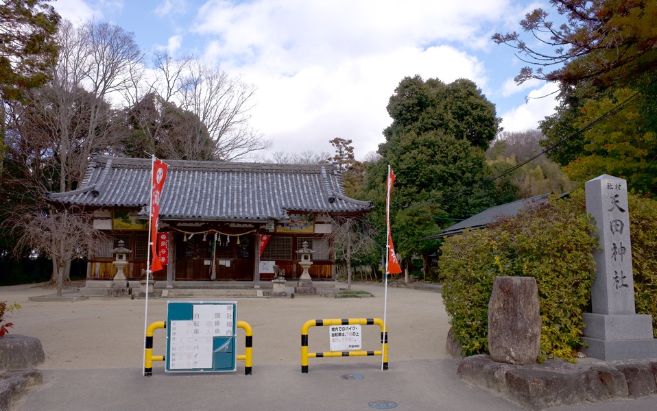 JR学研都市線の河内磐船駅(交野市)におり、小さくもりあがった東側の山にむかう。古い農家と新しい住宅がまざりあう集落に天田神社があり、本殿には、立派な絵が奉納されている。