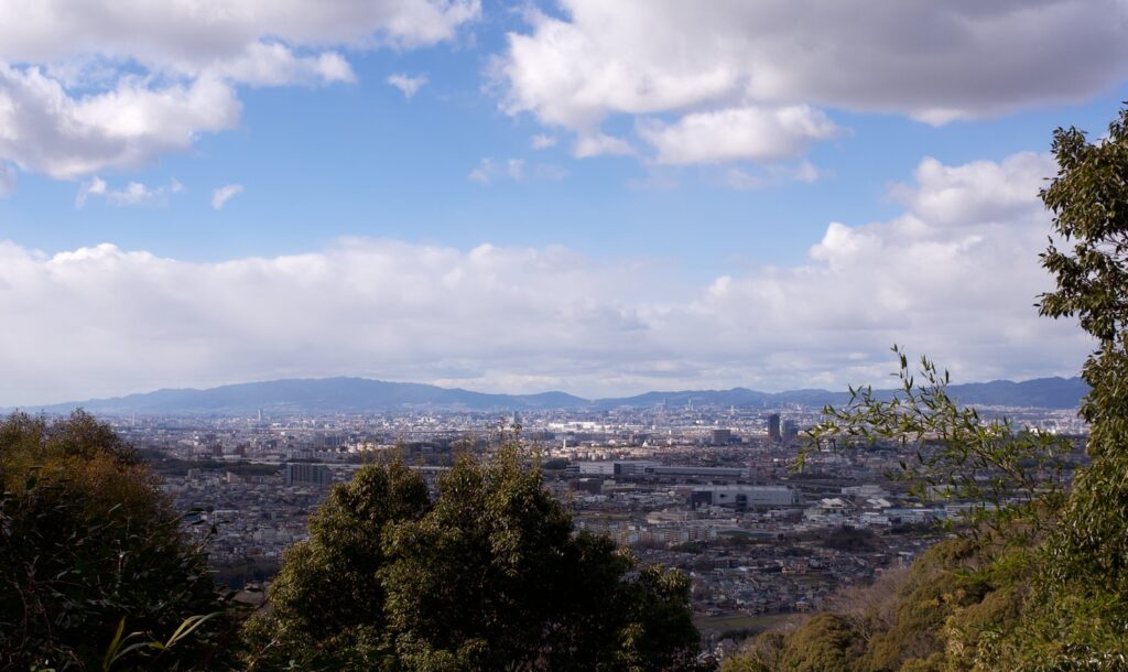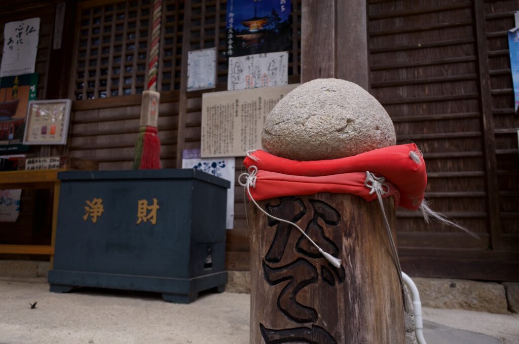 おむすび型の「なで石」や、愛らしい地蔵がならび。「災い転じて福となす」「天福岩」は、両手で抱いて自分の願いをひとつだけ3回となえるとかなうらしい。寺務所の隣からは大阪の街や六甲山が一望できる。