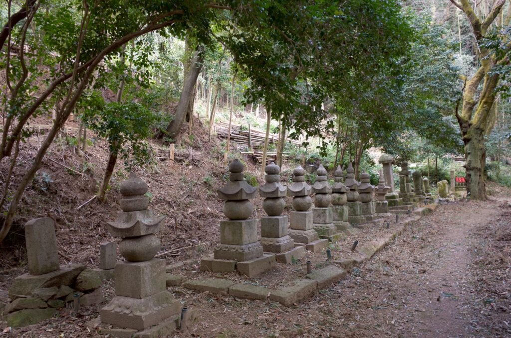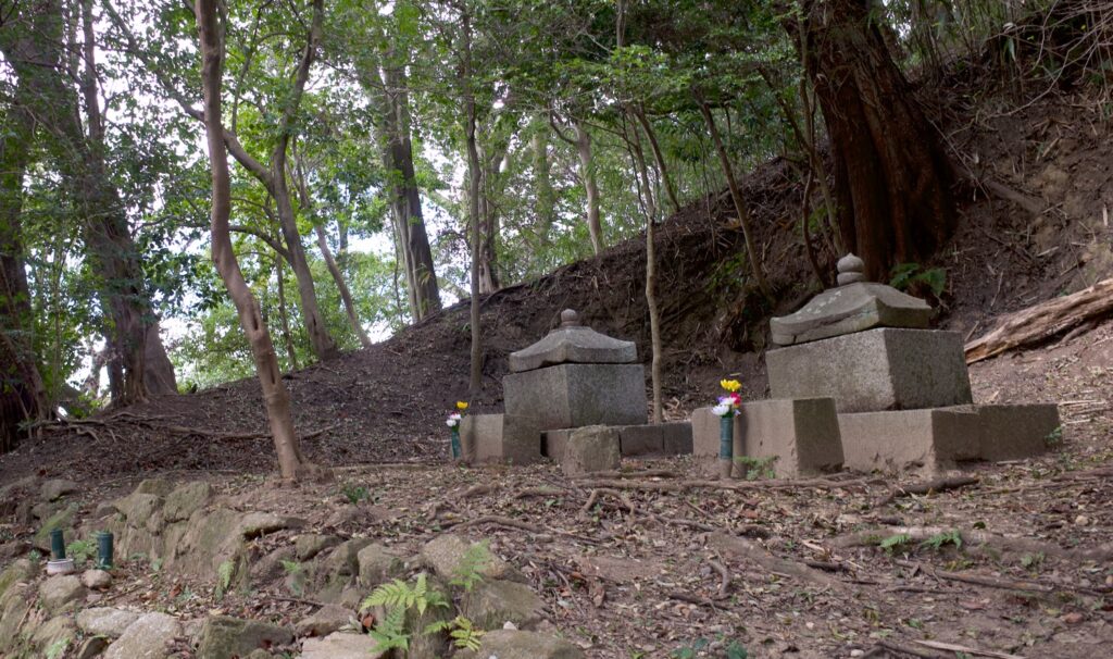 本堂の手前から谷にむかってくだると、「お大師様の水」と自然石を頭にした弘法大師像、それから歴代住職の墓など40以上の石塔や五輪塔があり、さらに100メートルほど先に四角形のがっしりした石塔が2つならんでいる。これが、亀山上皇とその妻佶子(きつし)皇后の「王の墓」という。ただ「王の墓」と名づけられたのは明治以降らしい。