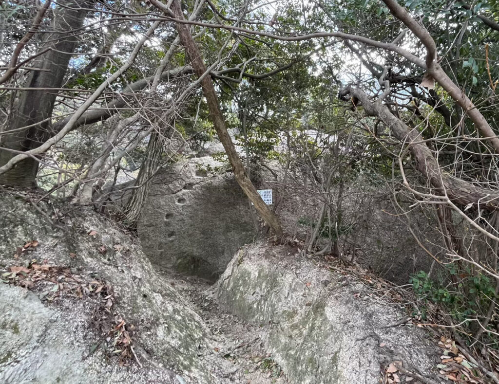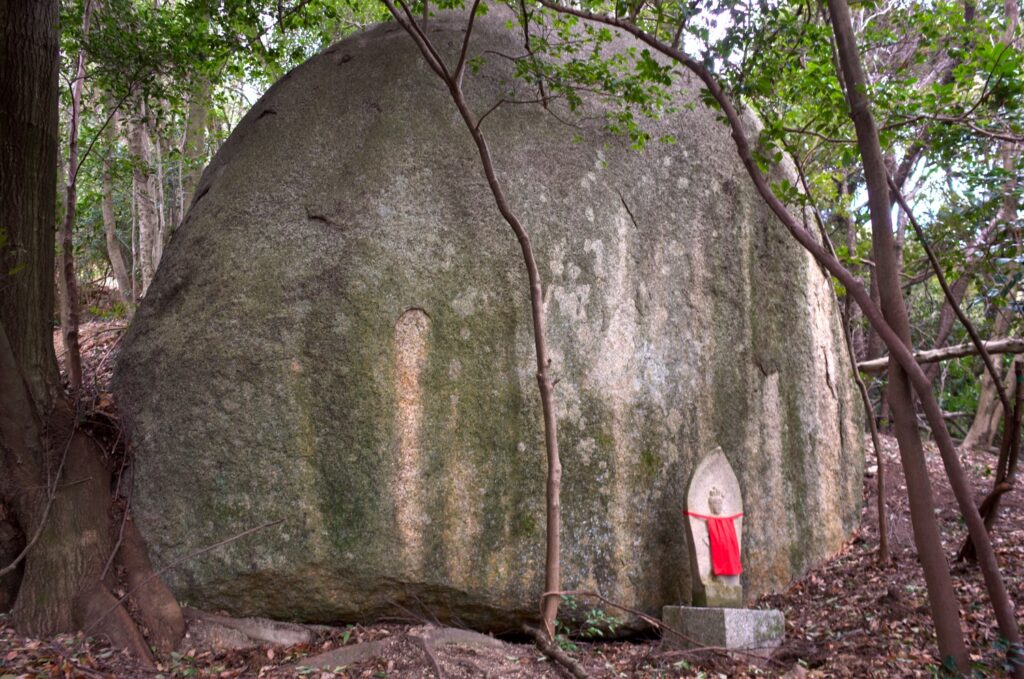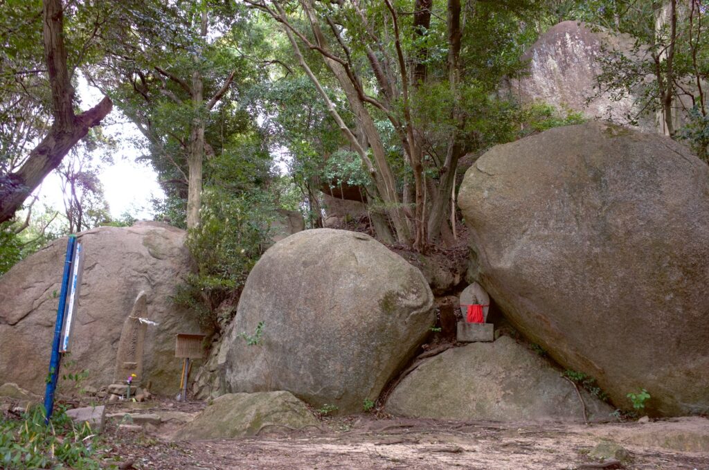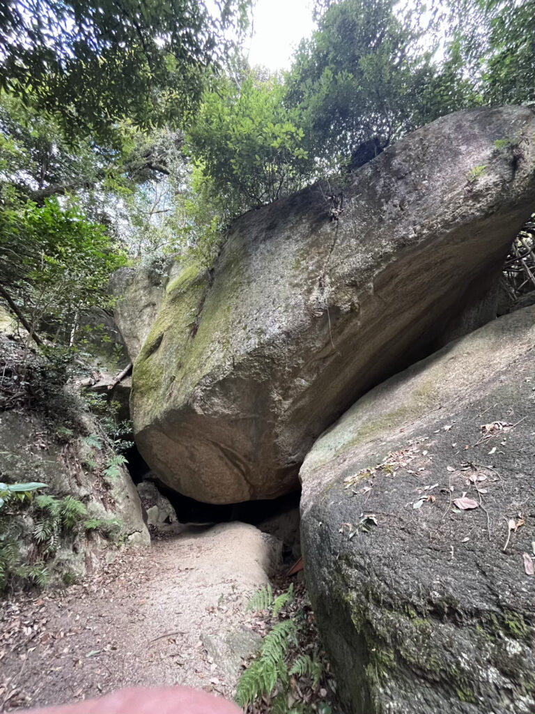 本堂にむかって左手の石段をのぼると、山肌から巨大な岩がニョキニョキとそびえている。この岩の下で空海は修行をしたのだ。