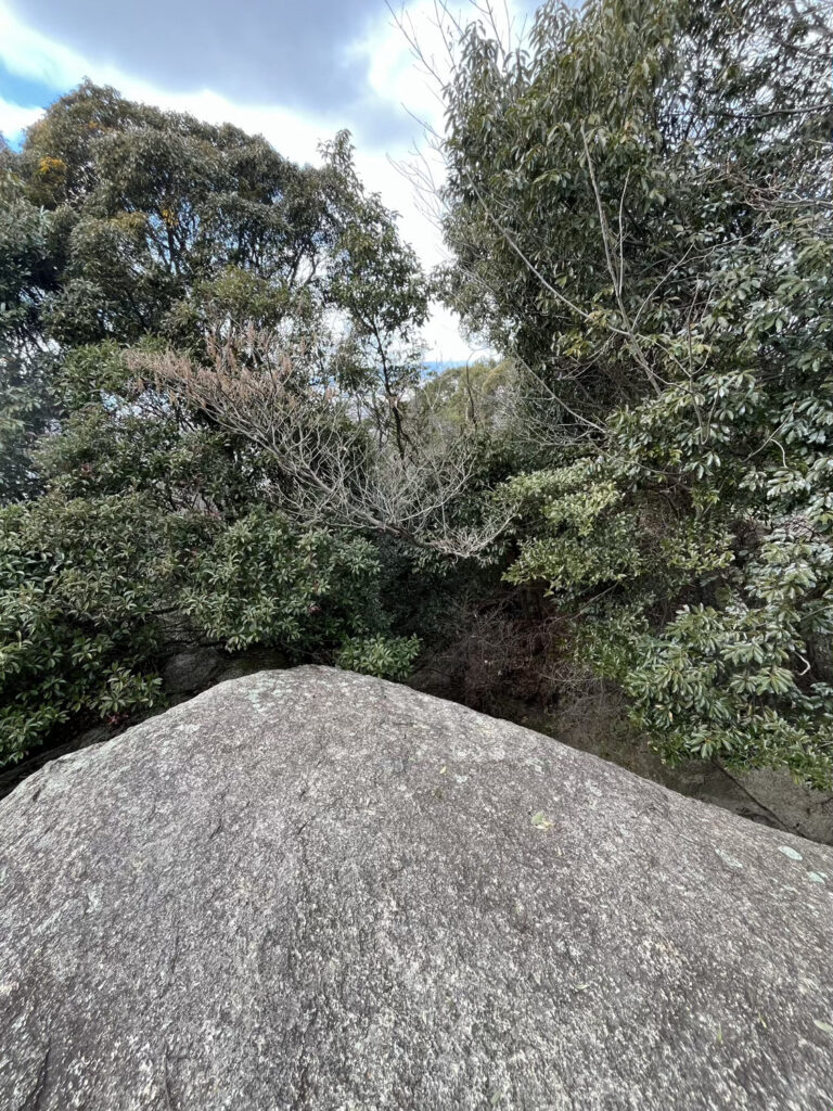 さらに尾根をのぼる。標高250メートルの尾根にまんまるとした「みろく岩」があり、その先の見あげるばかりの巨岩は足場が切られていてのぼることができる。これが「八丈岩」。