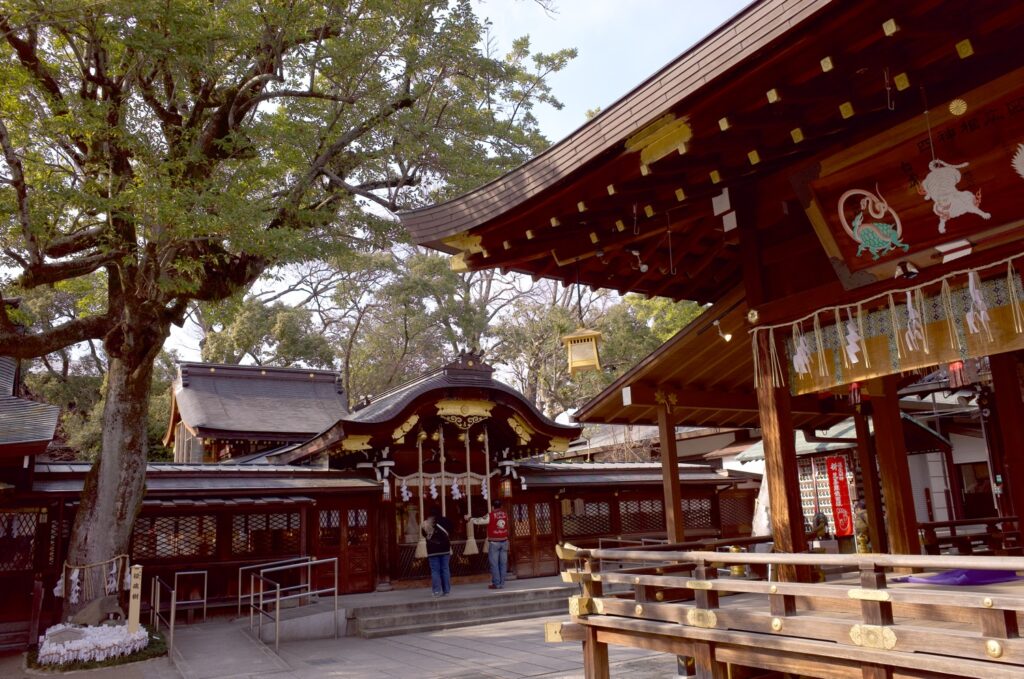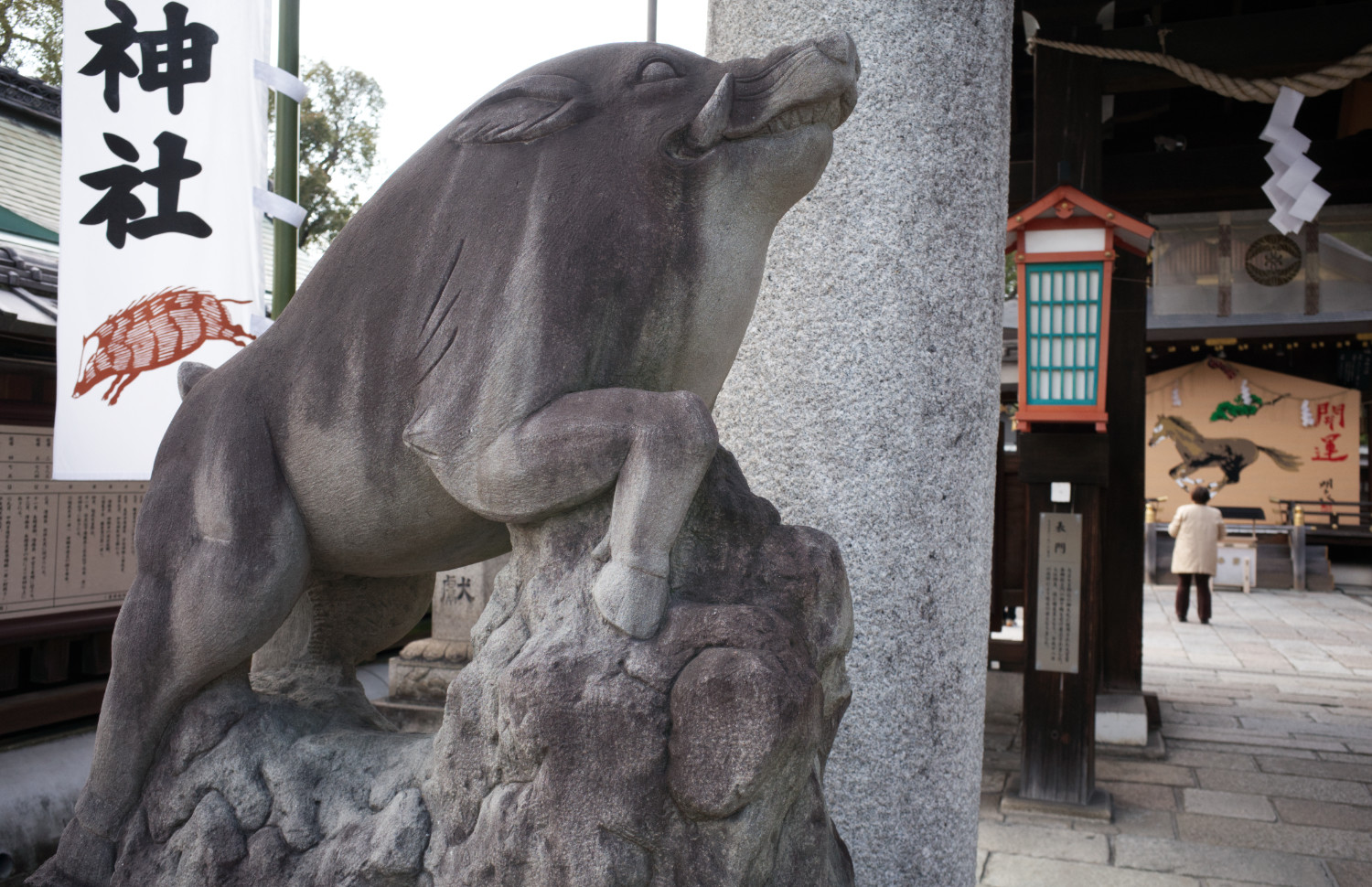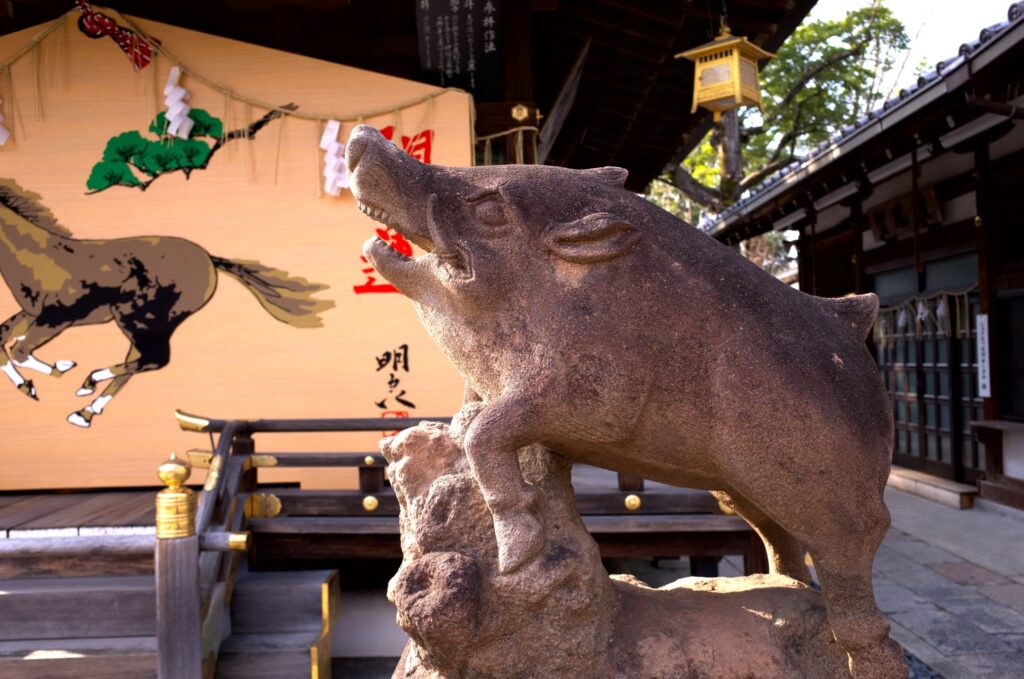 神社をまもる動物といえば狛犬(こまいぬ)だが、京都御所の西、烏丸通りに面した護王神社では、鳥居前に狛猪(こまいのしし)が鎮座しているという。