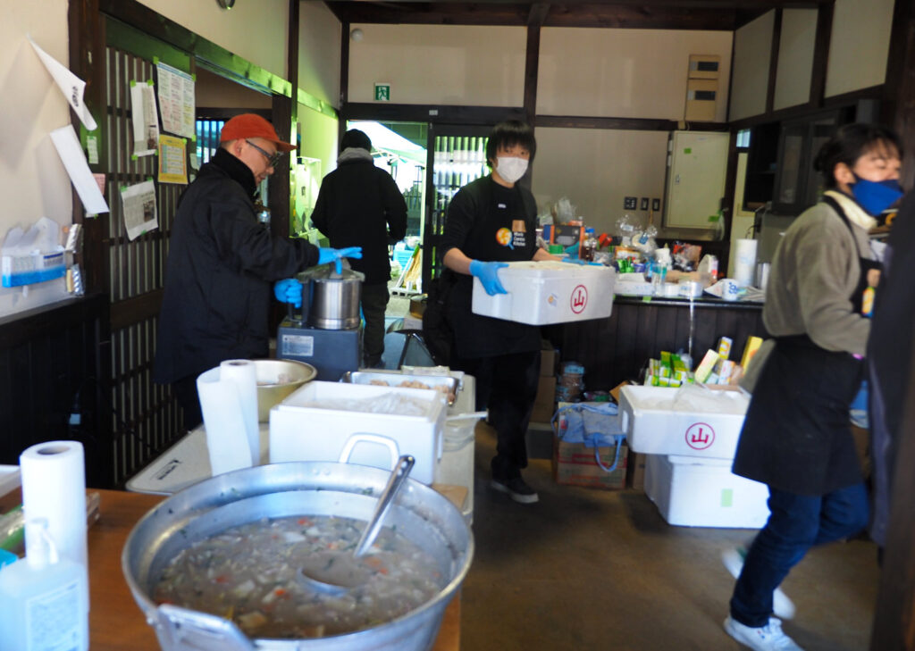神社がごはん、料理人たちがおかずを用意する。知り合いの飲食店をこじあけて資材を拝借して電話すると「店のものは食材でもなんでもつかえ」と言ってくれた。だから最初は、能登牛やアワビといった正月用の高級食材もスープにした。