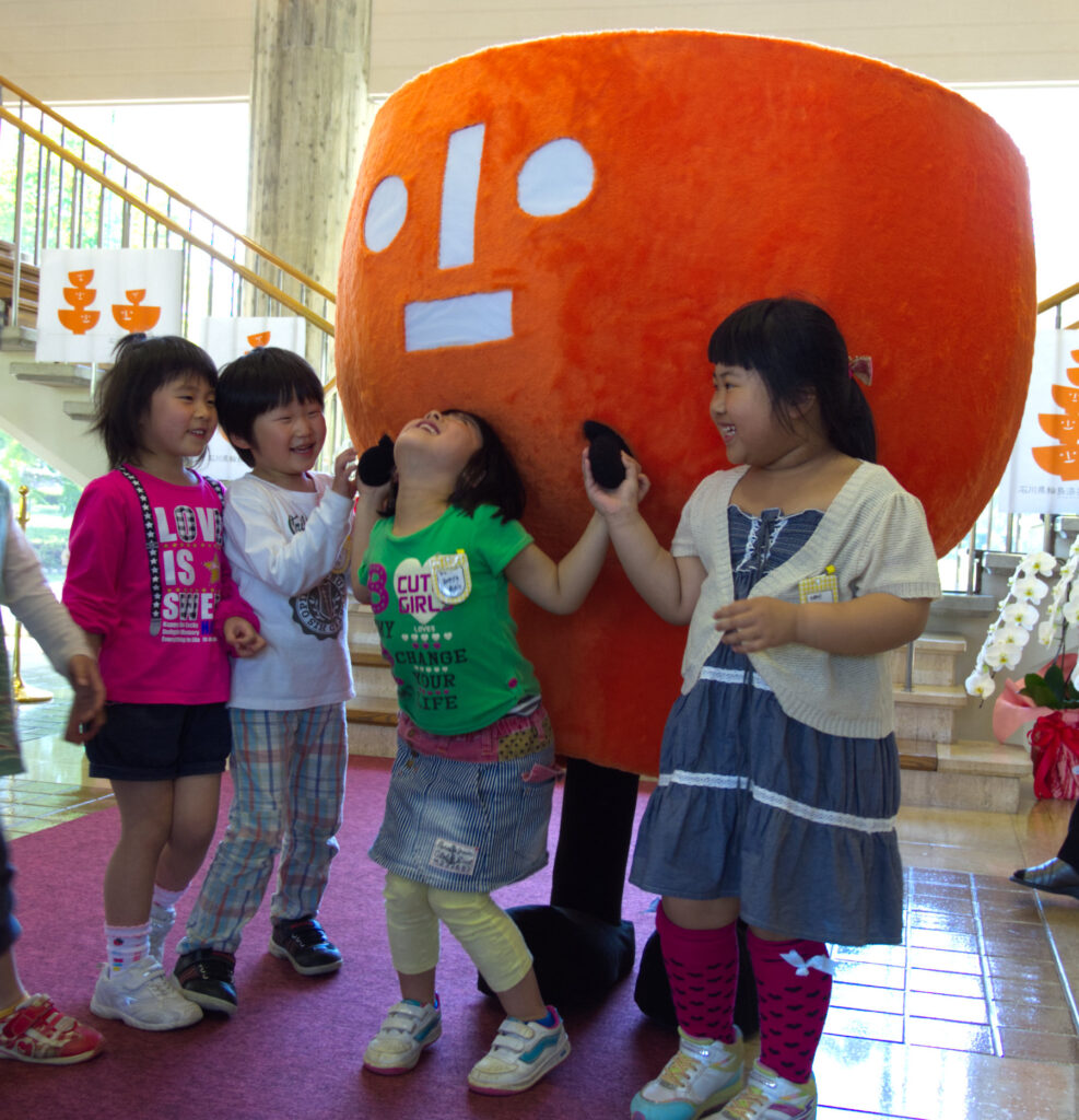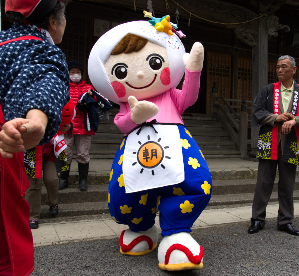 輪島朝市のゆるキャラは「朝いっちゃん」。王道をゆくスタイルで、子どもたちとおどって愛嬌をふりまいていた。