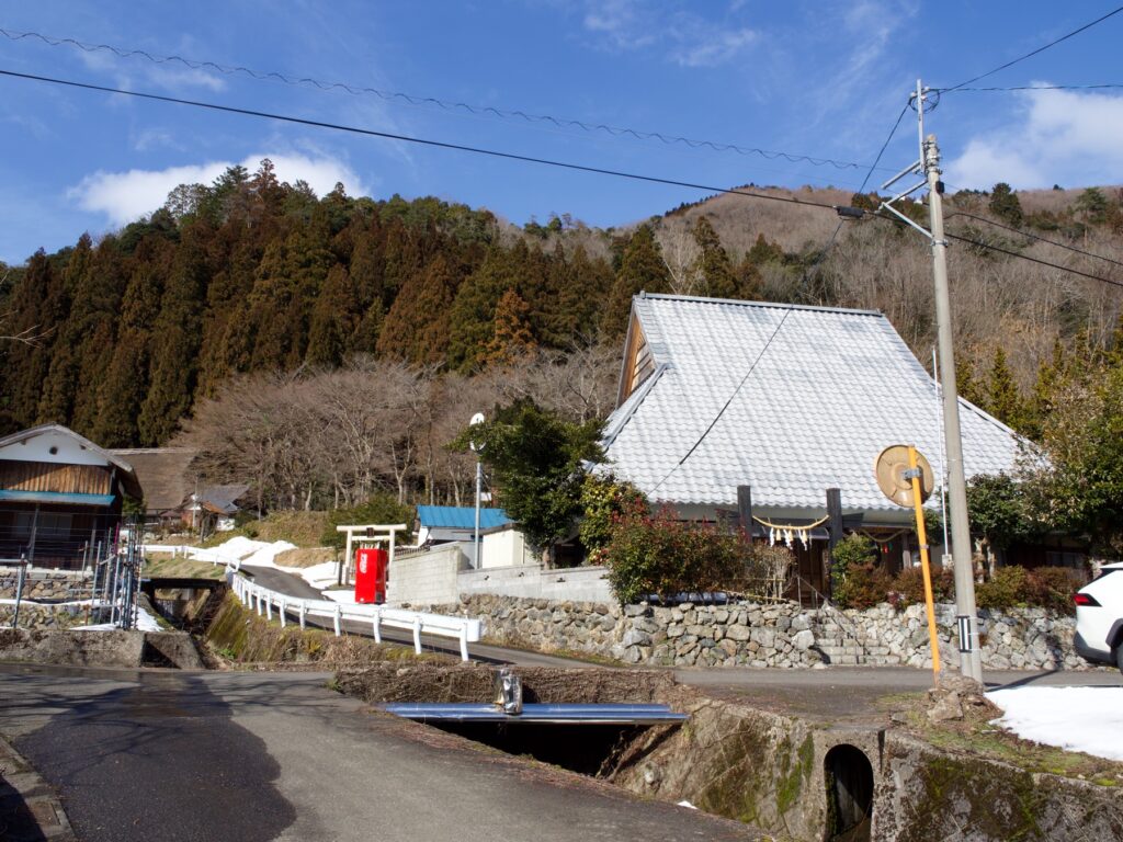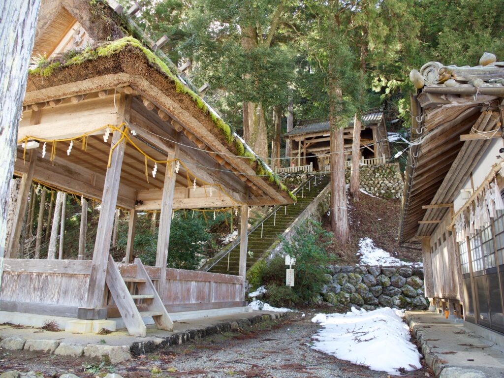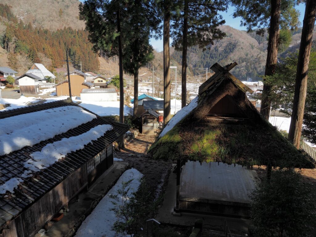集落の氏神である加茂神社の舞殿はかやぶき屋根で黄緑色の苔が美しい。石段をのぼった本殿からは、南川沿いのゆるやかな谷の集落が一望できる。神社の隣には代々神主をつとめる谷川家の墓がならんでいる。