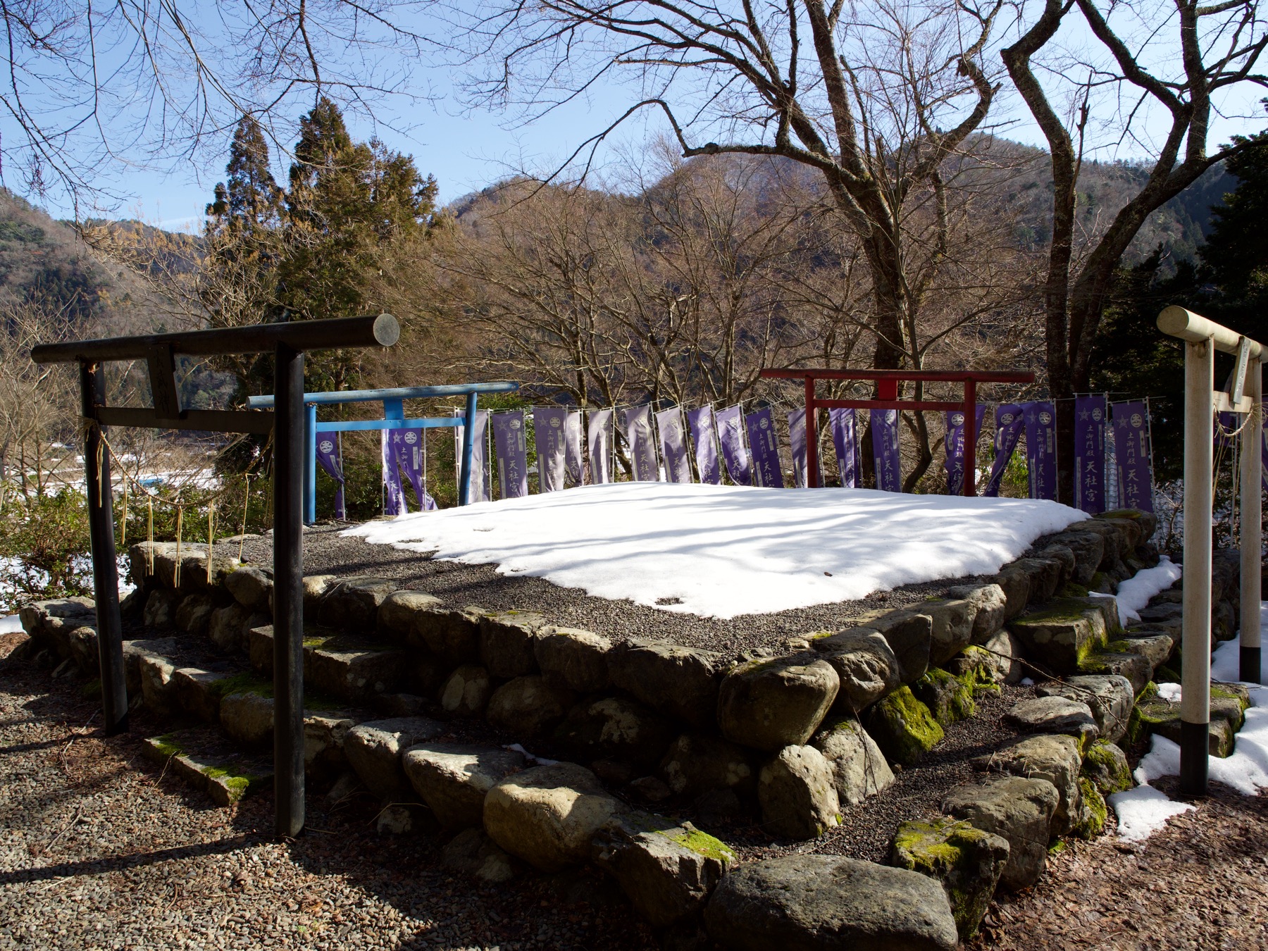 集落でひときわ立派な庄屋屋敷のような建物には「土御門神道本庁」という表札がかかっている。そのわきの「土御門総社」という鳥居をくぐって石段をのぼると、高さ50センチほどの石垣をつんだ「天壇」がある。