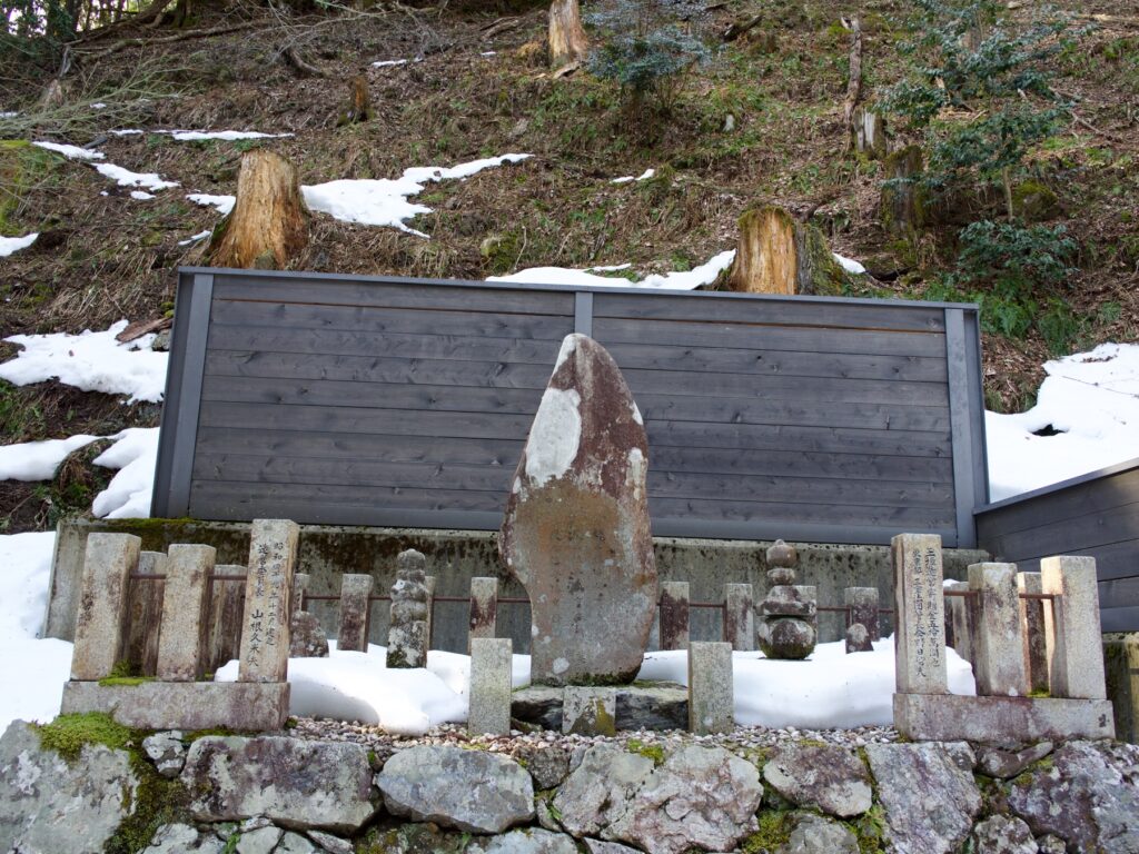 さらに谷沿いの杉林を100メートルほどのぼった堰堤の手前の石塔が土御門家3代(有宣・有春・有脩)の墓所だ。自然石の墓標で、両側に小さな五輪塔が配されている。幕末の1853(嘉永6)年に建立された。