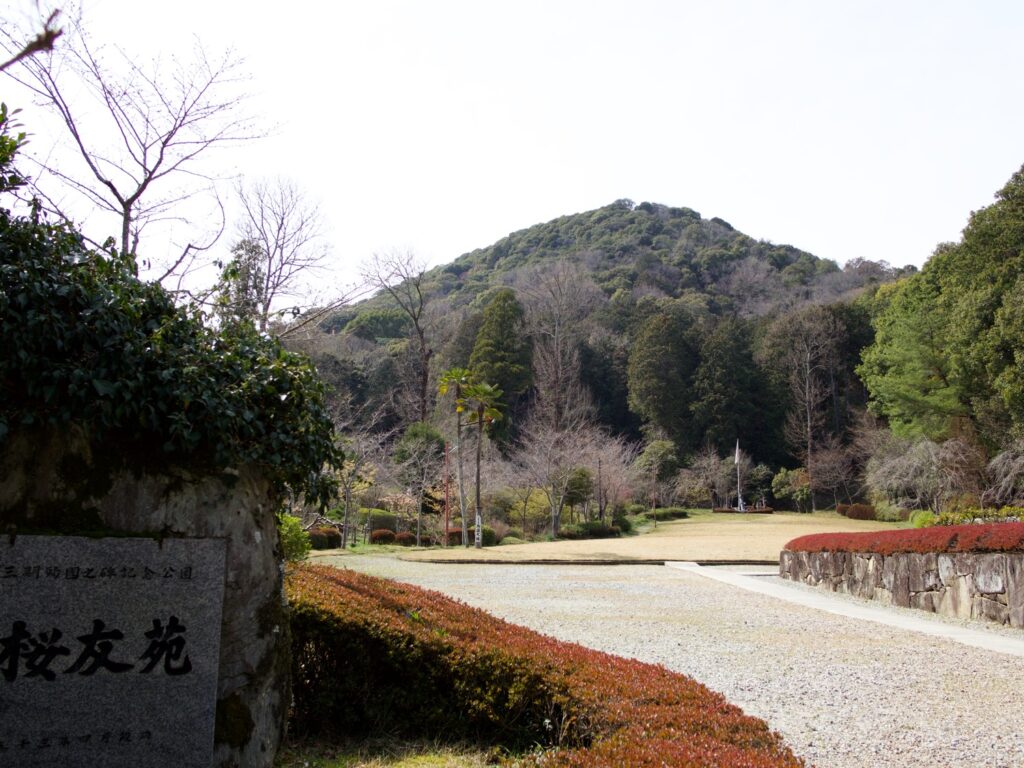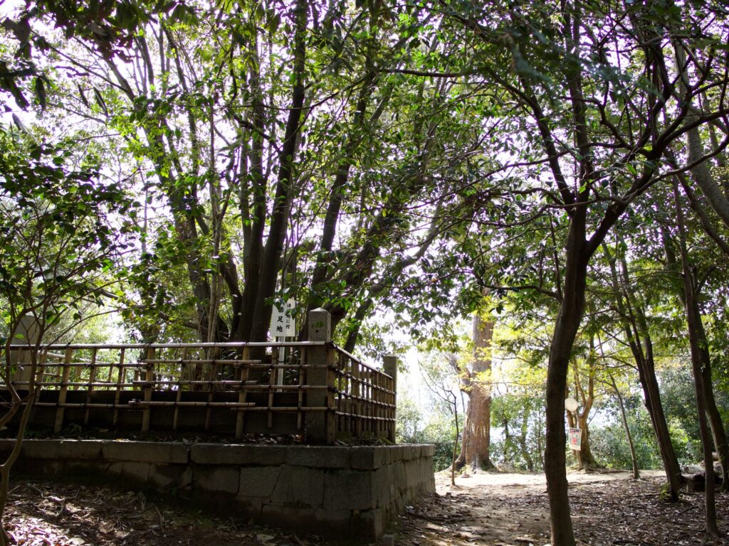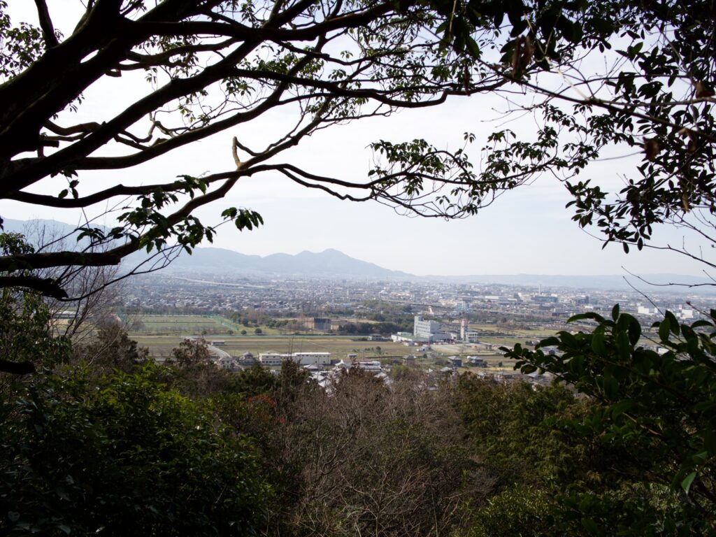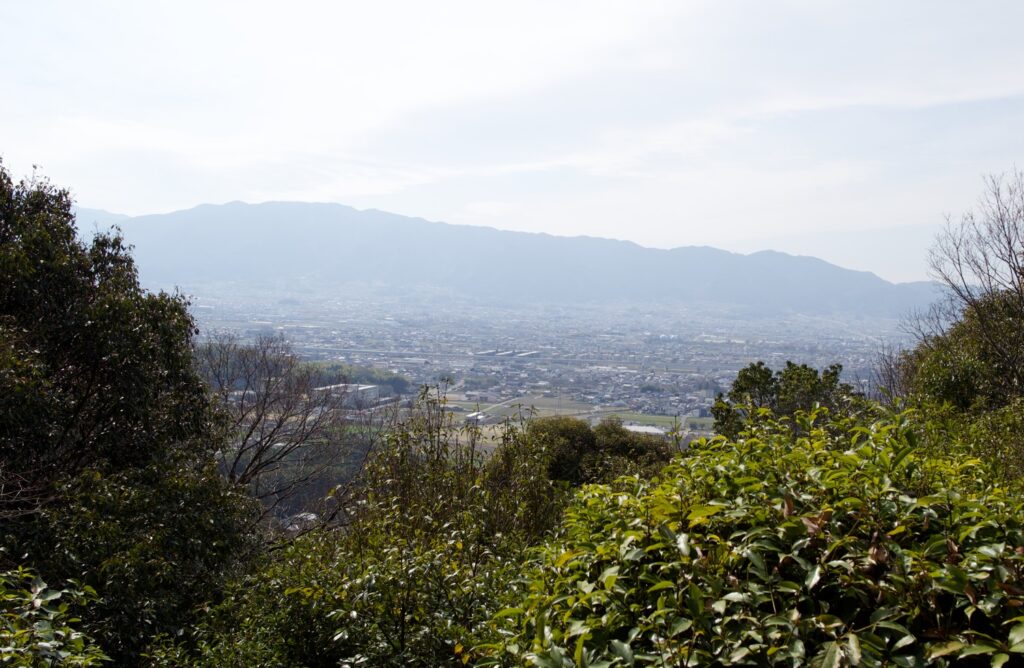 樫原神宮の一角から登山道がある。ちなみに樫原神宮は、どこにもまつられていなかった神武天皇のために1890(明治23)年につくられた新しい施設だからありがたみはない。登山道を40分ほどのぼると頂上にたどりつく。木々の間から西の金剛と葛城の山々、二上山の双耳峰をのぞめる。藤原宮跡は東2.5キロにある。
