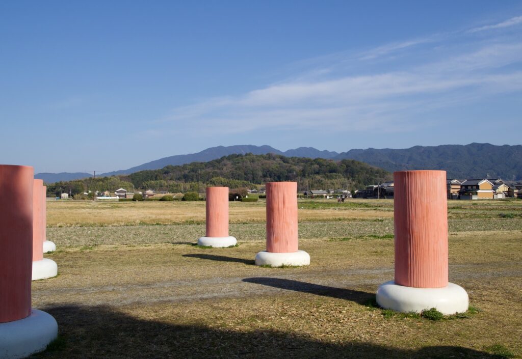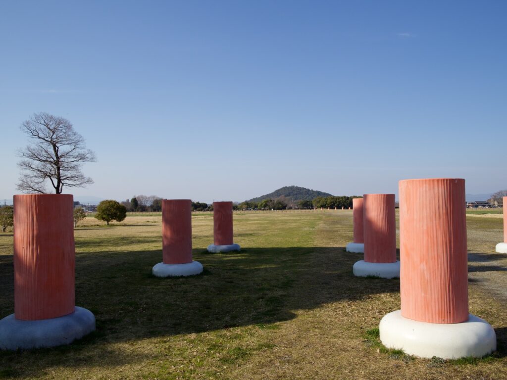広大な田んぼのなかに、朱雀大路跡や大極殿や朝堂院の柱が復元されている。